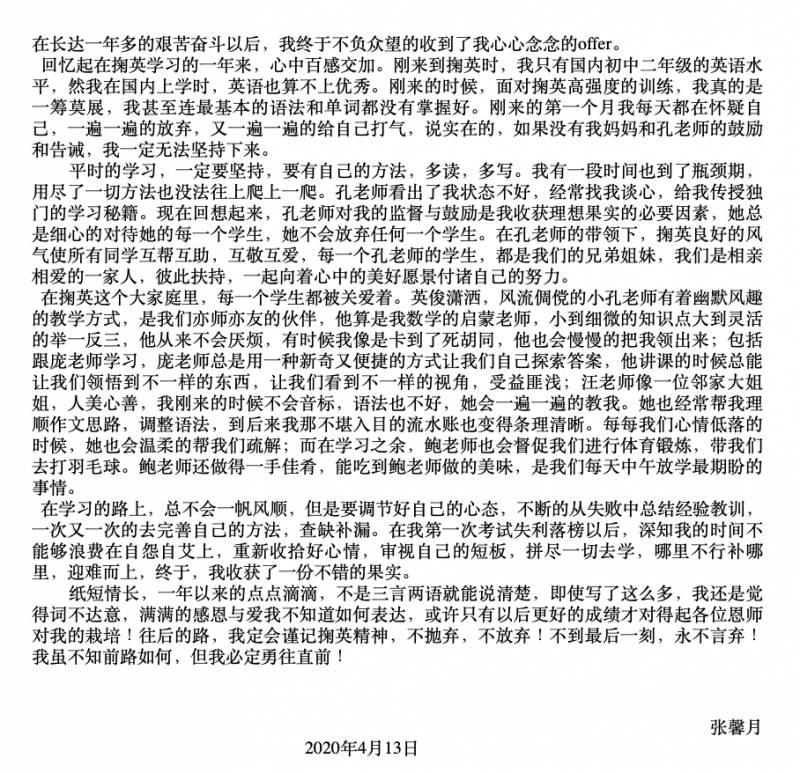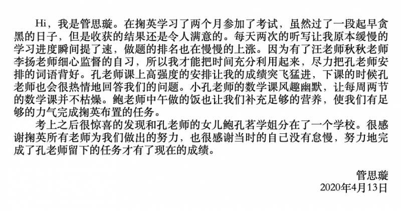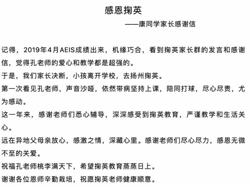 还有家长,写来了长长的感谢信,也与想要步入掬英教育这个大家庭的家长与学生分享经验。