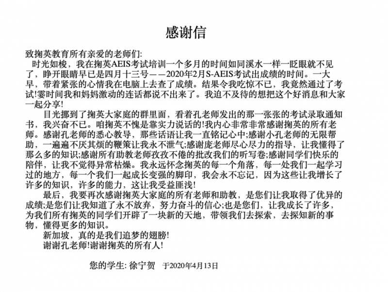 一份份录取通知书,为一个个等待了2个月翘首以盼的孩子,打开了通往新加坡理想学校的大门。也是对于专注耕耘AEIS考试的掬英教育,再一次结出的馨香硕果。