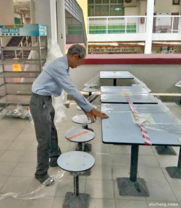 自落实阻断措施后,熟食中心禁止公众堂食,牛车水熟食中心将全部桌椅用保鲜膜封住,仅留两个座位给摊贩。怎料,一名穿着浅蓝衬衫和西装裤的阿叔却动手扯烂桌椅上的保鲜膜,甚至连收盘区的也不放过。