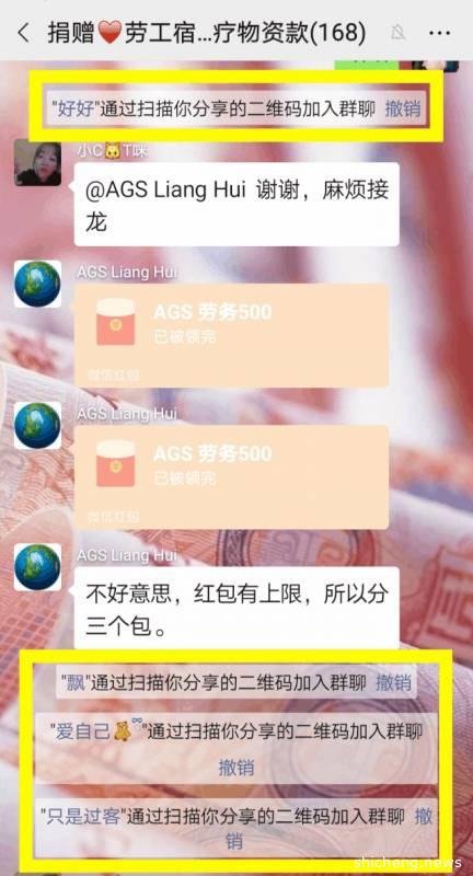 我们一些善心人士自发的组织了一个群,大家纷纷慷慨解囊捐善款给劳工们买医疗物资,由于我的微信账户异常无法私信给我发红包,就安排大家分别往群内发,只有我一个人接受,最后统计!