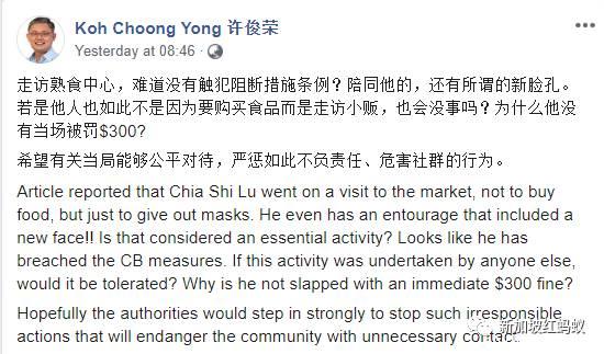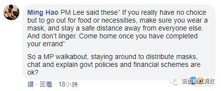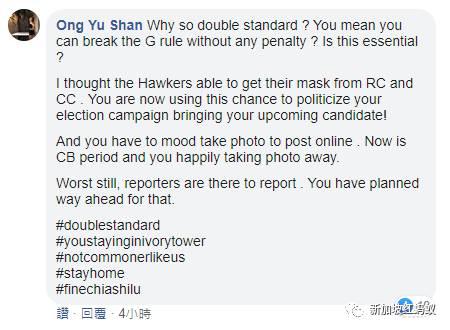 一些网民则强调政府的阻断措施条例不应该有双重标准: “这是双重标准吧?难道你就可以违反政府条例,逃过惩罚吗?这(走访基层)是必要的吗?我想小贩应该有办法从居委会和联络所拿到他们的口罩。你现在是借机带着下届大选新人进行竞选活动。”