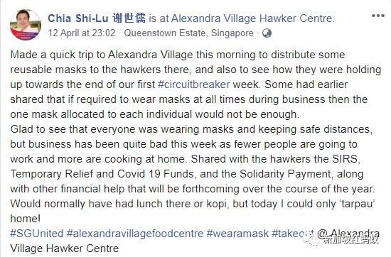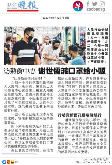 综合《联合晚报》和《联合早报》报道,谢世儒当天早上走访了位于红山1巷的亚历山大村熟食中心,向当地小贩分发由全国商联会提供的可重复使用口罩。