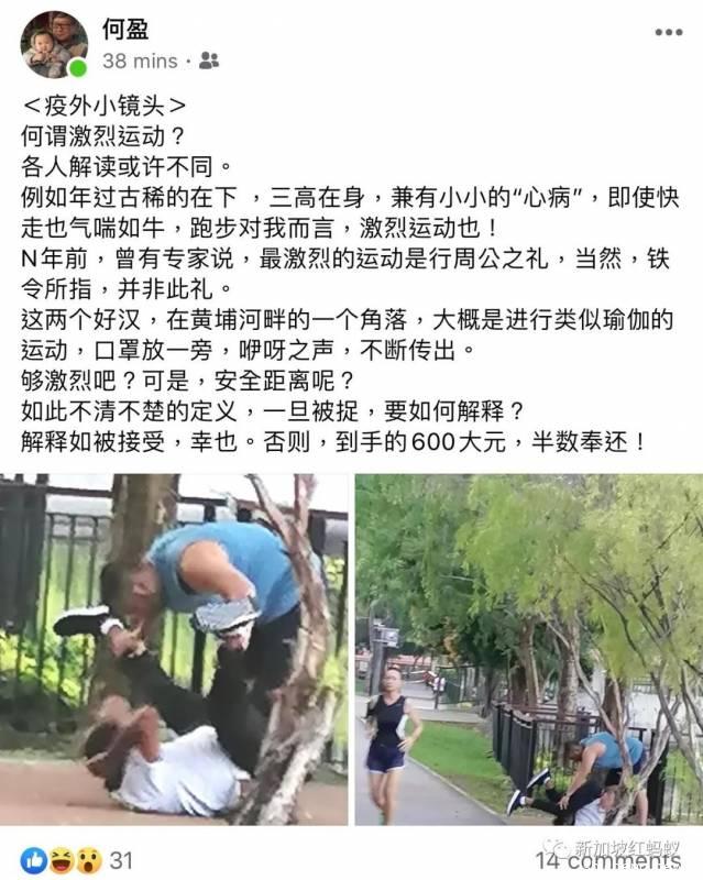 有网民也分享了自己跑步时因为发出一声“咳嗽声”,被稽查人员逮到的过程。他说,在邻里公园跑了10公里后,停下来喝口水时为了清理喉咙正常地“咳了一声”,这时,一名自称是公园局稽查员的女子就过来要求他立刻戴上口罩。