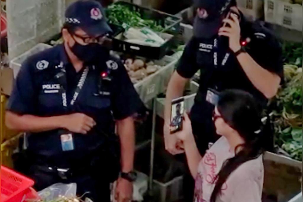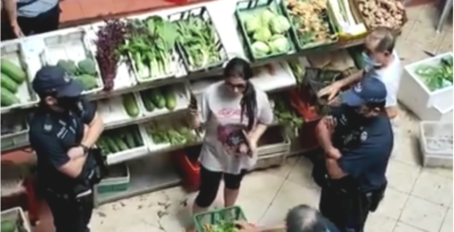 女子后来将手机收起,以向菜摊的摊贩付款,之后被警员带到一个角落。