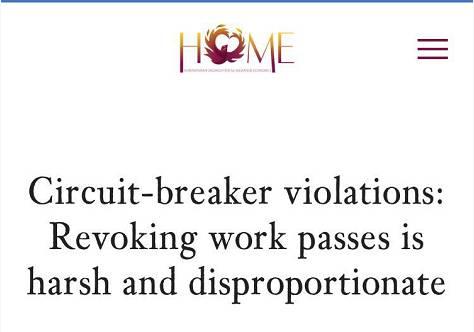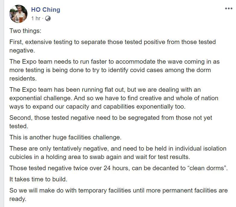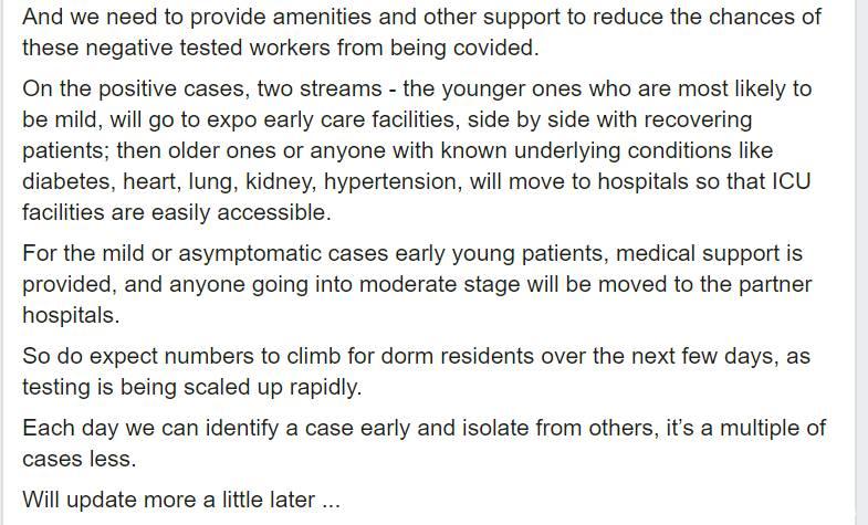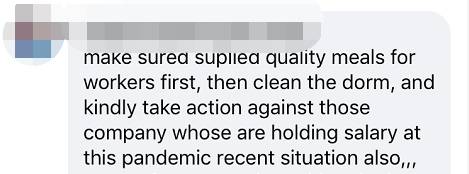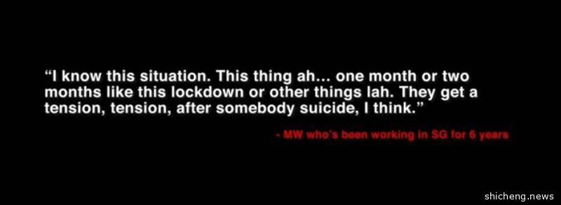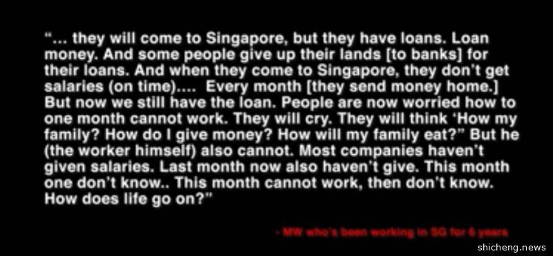 “他们来新加坡,但他们身上还有贷款。他们借钱来这里,有的人甚至是放弃他们家里的土地,抵押给银行。而他们到新加坡工作以后,也不能马上拿到薪水。每个月他们都需要寄钱给家里,同时还有身上的贷款。大家(客工)都很担心一个月不工作,事情会变成什么样?他们会哭的,他们会想‘我的家庭该怎么办?我要怎么给钱?我家里人要吃什么(来活下去)?’ 很多公司还没有出粮,有的连上个月的薪水也没给,这个月的还不知道。这个月不能做工,所以不知道,生活要怎样继续?”