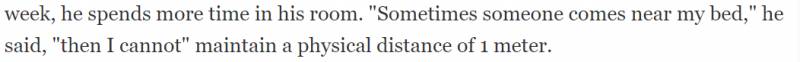 “我很害怕, 我们得当心病毒。但是回家也不会更好,至少待在这里(宿舍)安全。我这个月没办法往家里打钱,因为公司延迟出粮了。上个月他们有给。”