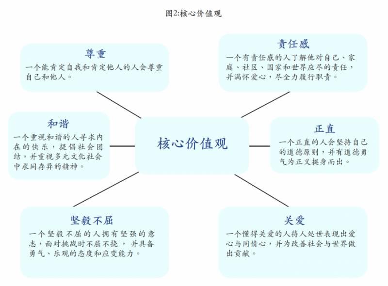 它的六大核心价值观是:尊重、责任感、坚毅不屈、正直、关爱、和谐。新加坡教育的这一重大转变,突出了品德教育的重要性。新加坡教育者、学生家长及社会普遍达成了共识,他们认为学生成绩固然重要,但成绩不是生命中唯一大事,在学校里,还有许多生活上的事物值得学习。