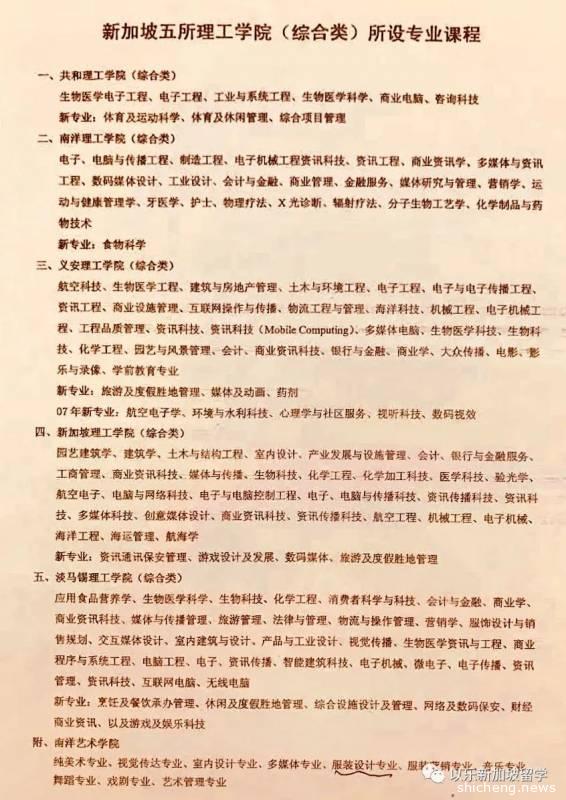 新加坡五所综合类理工学院所设专业课程