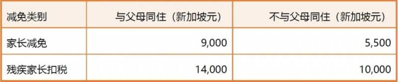 如果纳税人在上一年度因照顾自己或配偶的父母、祖父母或曾祖父母而花费至少新加坡币2,000元,纳税人即可申请父母/残疾父母减免。非身体或精神残疾的受养人,在上一年度须年满55周岁。此外,受养人在上一年度的收入应不超过新加坡币4,000元。