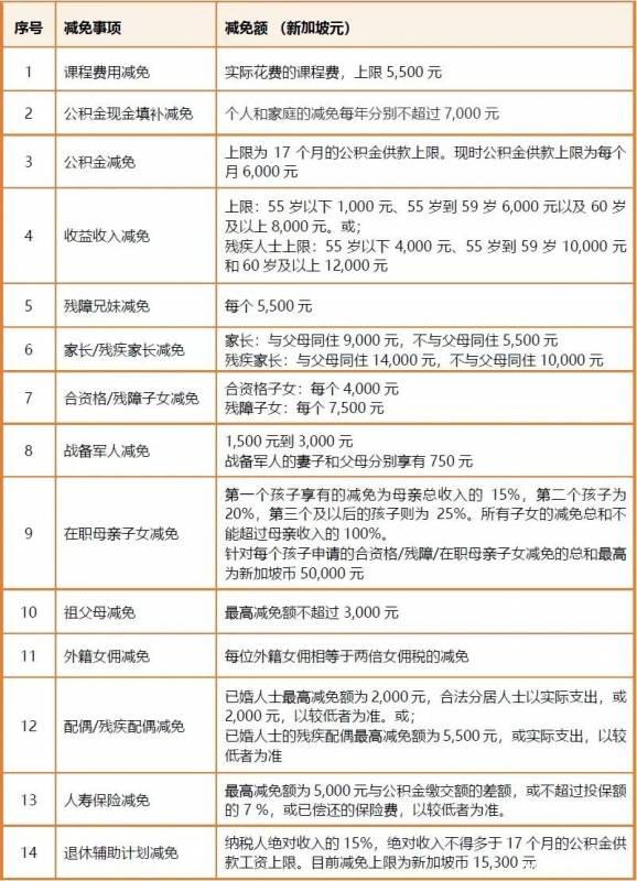 新加坡税务居民有权就子女抚养费、职业培训费、保险费以及公积金缴款等事项享受个人所得税减免。纳税人在报税时可以根据个人情况申请个人所得税减免。