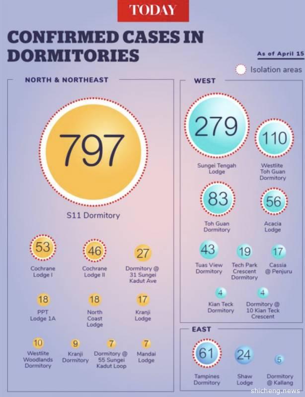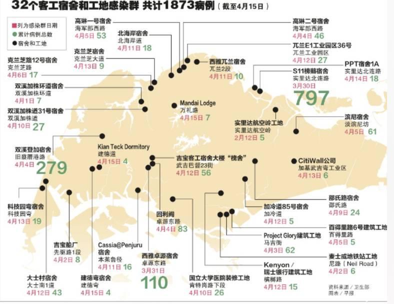 而截止到4月15日,新加坡的32个劳工宿舍和工地感染群中,共确诊1873个病例,数量惊人。