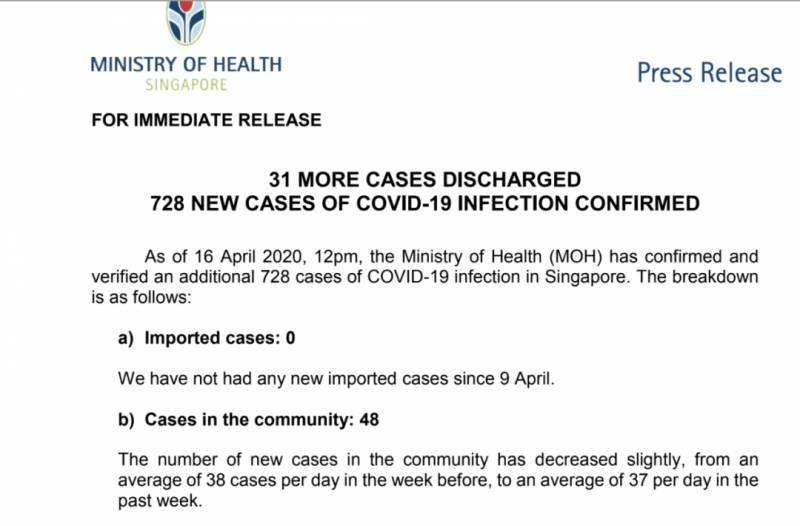 新加坡卫生部(4月15日)发布公告,本地单日新增冠状病毒确诊病例为447起,其中404起是住在劳工宿舍的工作准证持有者、另有五人是住在宿舍外的工作准证持有者,本地社区病例为38起。新加坡已连续六天没有出现境外输入病例。