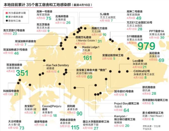 (4月16日),新加坡暴增728名确诊病例,新增5个感染群。其中,有一个是位于双溪加株4街的仓库,位于双溪加株3街的办公楼,剩下3个,则都是客工宿舍感染群。