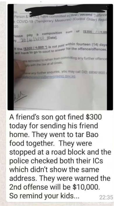 就在这周,新加坡网络疯传一张罚款照片,称新加坡一名男子因违反新加坡抗疫措施,被罚款300新币。有人说,其男子开车送自己朋友回家,途中遇到了警方临检路障,然后警方就向他们要身份证,看到身份证上的地址不同,便罚款300新币。