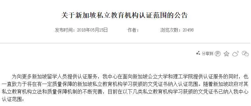 中国教育部留学服务中心早在2018年,就在《关于新加坡私立教育机构认证范围的公告》中公布了经认可的私立教育机构!