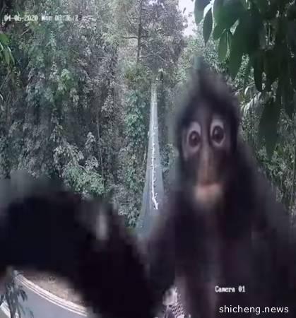 (新加坡讯)汤申自然公园是新加坡许多濒临绝种动物的栖息地,那里的闭路摄像机上周就意外捕捉到稀有黑脊叶猴攀上绳索桥,爬到摄像机前,犹如在“自拍”。