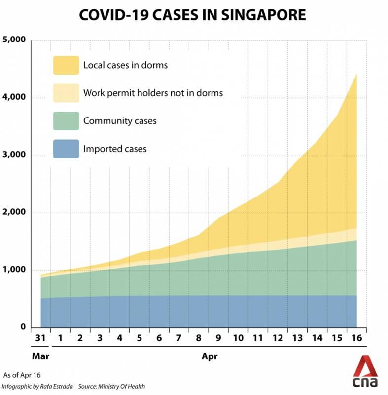 最新的统计数据显示,目前新加坡的新冠患者主要是来自于本地感染,从下图中可以看出,4月1日到7日之间,本地感染者的增速还比较平稳,每日增长人数也并不多,增长曲线也较为平缓。而到了4月8日以后,曲线突然呈现陡直状态,增速惊人。