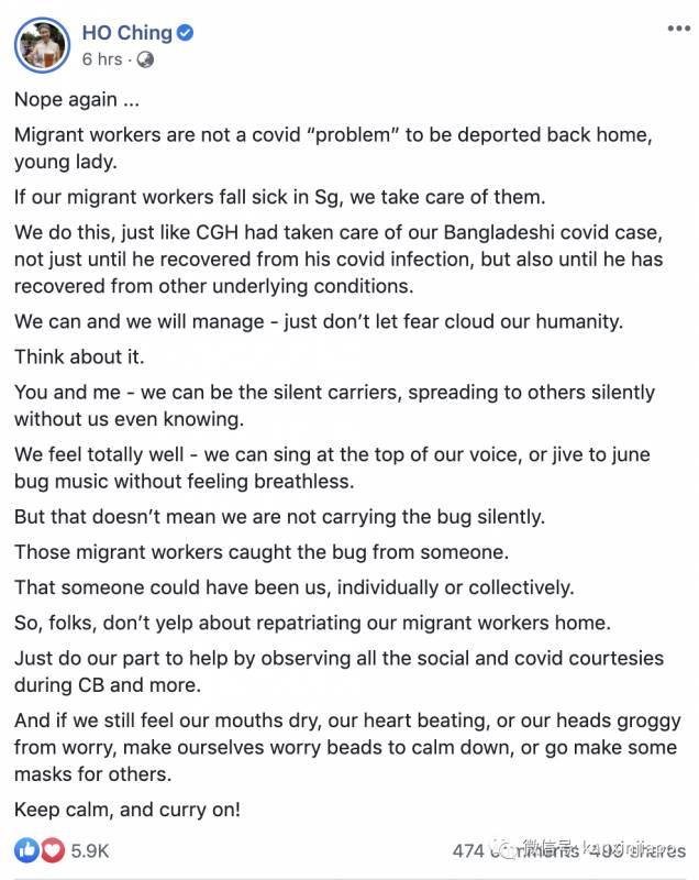 新加坡总理夫人何晶昨日在脸书上也发布贴文表示,不能把确诊外籍劳工送回国,新加坡必须照顾这些确诊客工。