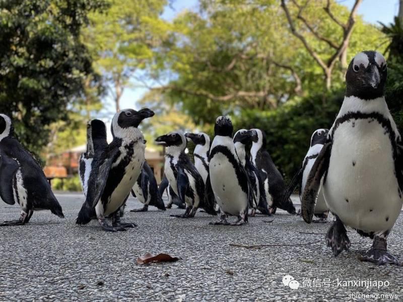 新加坡动物园也趁暂停营业期间,让自家的企鹅活动筋骨,走出自己的生态园在动物园区内走动。