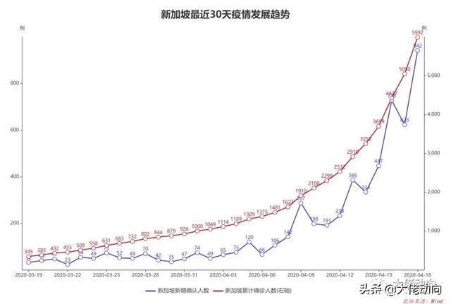 从累计确诊人数来看,4月13日至19日,新加坡累计确诊人数分别为2918、3252、3699、4427、5050、5992。新加坡这个城市国家,人口只有564万,确诊占比高达千分之一,每天新增是整个国家的万分之一,这个比例不可谓不惊人。