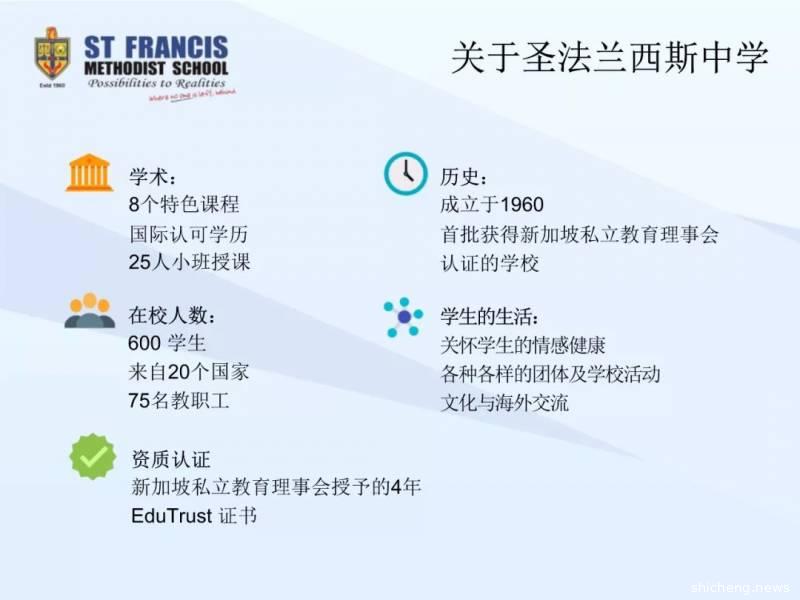 圣法兰西斯学校 创立于1960年,圣法兰西斯卫理公会教会学校(SFMS)是新加坡的顶尖私立学校之一。学校每年招收约600名来自新加坡及包括 中国 、越南、泰国、印度尼西亚、缅甸及日韩在内20多个其他国家的中学生及大学预科生,并为学生的不同学习需求提供不同的学术途径。