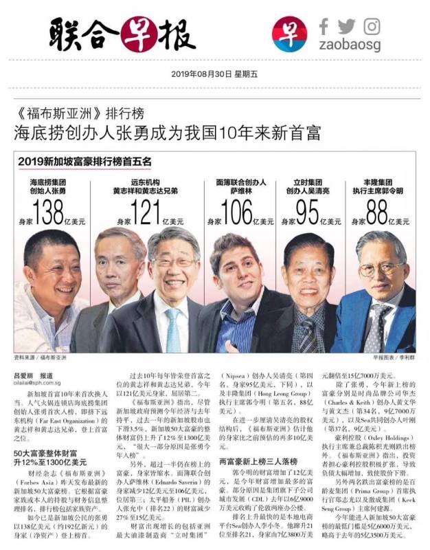迈瑞医疗董事长李西延成新加坡首富(海峡日报报道)