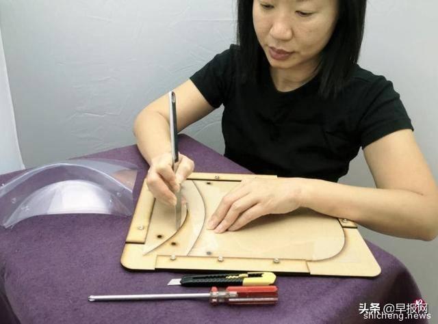 刘韵冰说,只要将透明塑胶片放在模具上,根据指示裁剪和打洞,就能做出简易的防护面罩。(受访者提供)