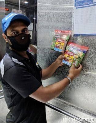 清洁客工拉克卜在每天都要清洁和消毒的组屋电梯内收到居民留下的礼包,答谢他的努力。(受访者提供)