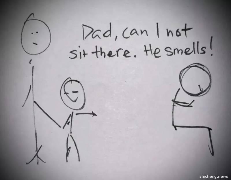 “爸爸,我可以不坐那个外劳旁边吗?他好臭哦。”