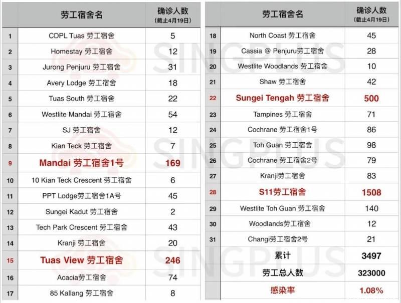 截至4月19日,新加坡外籍劳工确诊人数已达3497,感染率高达1.08%。情况最严重的的S11榜鹅劳工宿舍1508名客工确诊,占新加坡确诊病例总人数的22.9%。
