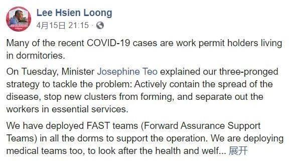 李显龙总理也于4月在Facebook上再次发帖强调了外籍劳工对新加坡的贡献,以及在对抗新冠肺炎疫情期间,他们给予的谅解与合作。表示:新加坡政府会同劳工共渡这段艰难的时期。