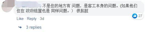 Facebook上诸如此类的评论不止这一条,这种说法则是指责外籍劳工自身卫生或是素质问题导致条件恶劣。