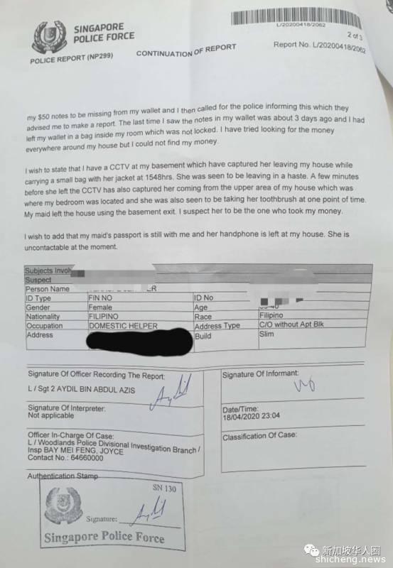 今天收到新加坡网友投诉称,女佣半夜趁雇主睡觉偷跑出门私会情郎,还偷了300新币,目前雇主已经报警!
