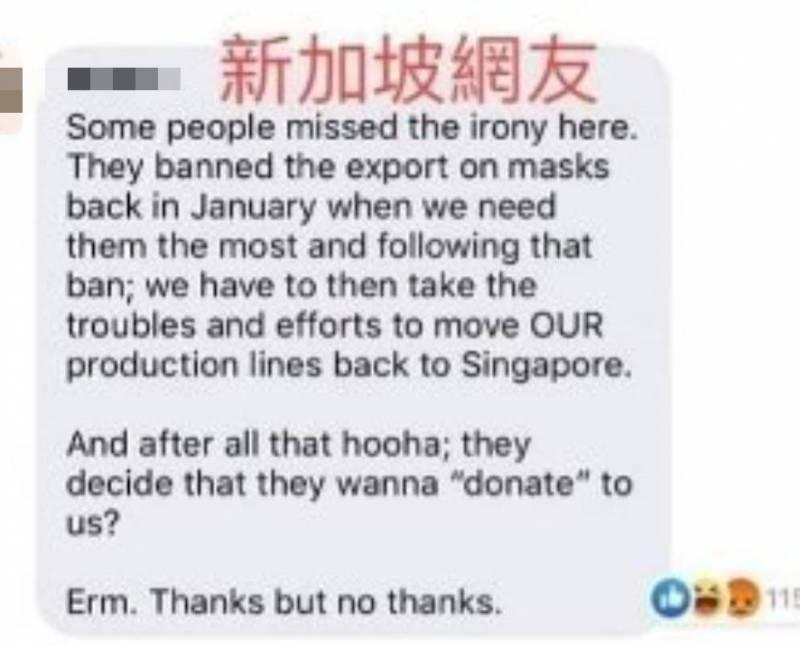 一篇文章“台湾地区捐赠口罩给新加坡”