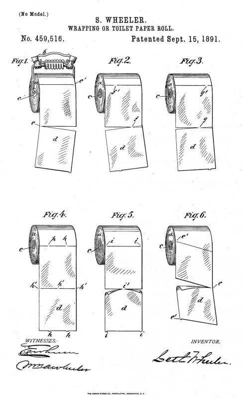 超市里最占空间的货品应该就是林林总总的厕纸了。很难去考证谁是发明厕纸的人,不过第一个在美国注册“滚轴厕纸卷”专利的是纽约的韦勒(S. Wheeler),在厕纸上打洞方便撕脱的专利也是他的,都在1891年。