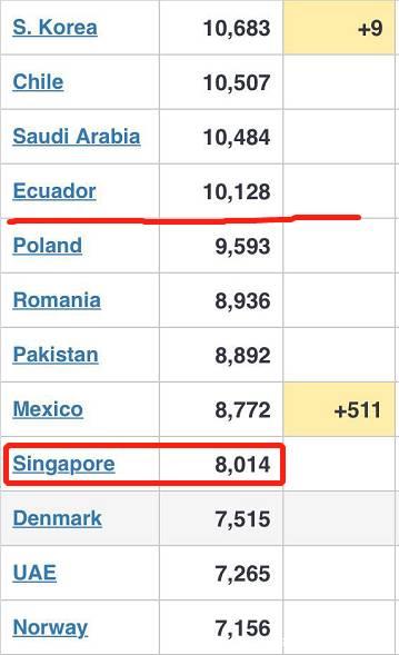 现在全球的病例至少有240万,总计病例在1万以上的就有27个国家,而27往后数5位,就到新加坡了......