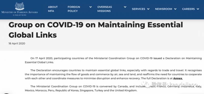 4月17日,新加坡与加拿大、英国、巴西、法国、德国,印尼、意大利、墨西哥、摩洛哥、秘鲁、韩国、土耳其等13国发表联合宣言,呼吁全球各国合作,在联手抗击疫情时,也确保国际货物和人员流动保持通畅。