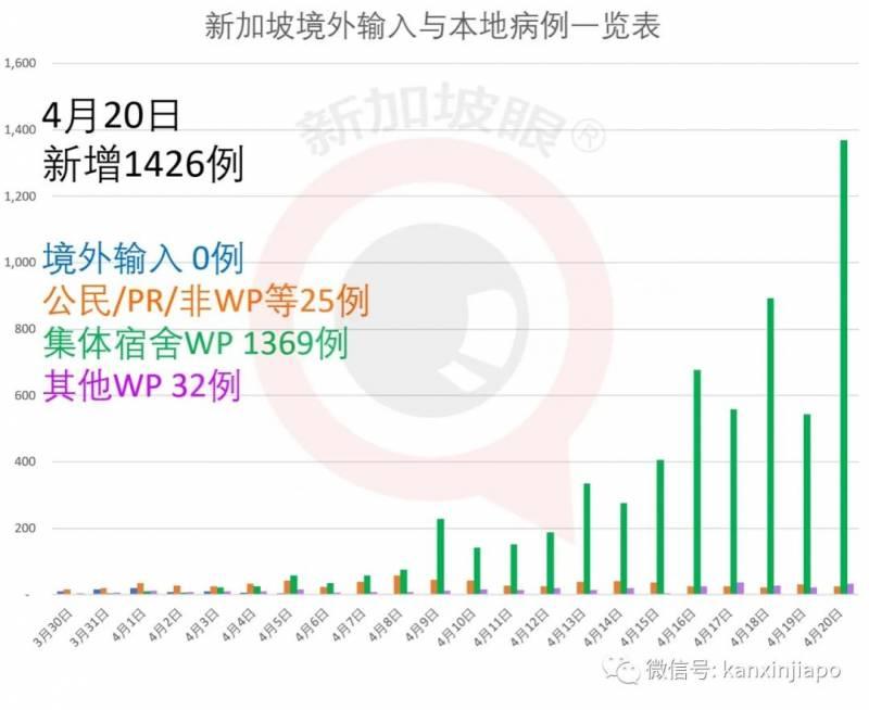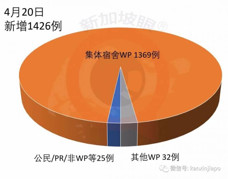 昨天确诊人数比前天激增一倍,确诊患者依旧主要是集体宿舍客工群体。1426例新确诊病例中,有1369人是住在集体宿舍的客工,32人是住在宿舍外的工作准证持有者(WP)。