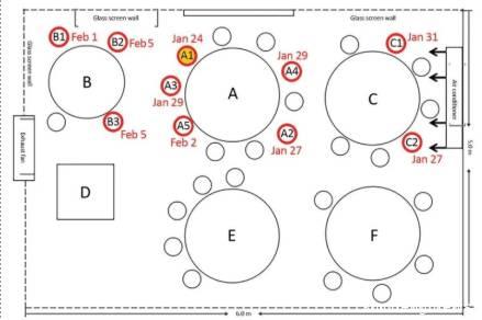 根据研究,广州的A、B、C三个家庭,共十人在同一家有冷气的餐厅用餐。其中,A家庭1月23日从武汉抵达广州,患者A1隔天与其他三名家庭成员在餐厅用餐,与B和C家庭坐在相邻的桌子旁。之后,三个家庭的共十人都确诊染病,而调查发现,B和C家庭中受感染者的唯一已知接触传染源是餐厅中的患者A1。