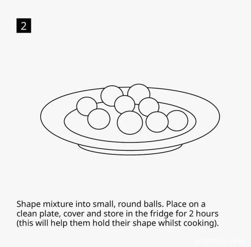 然后将其揉成一个个圆形小球。摆在干净盘子,盖上并存放冰箱2小时(方便烹煮时的定型)。