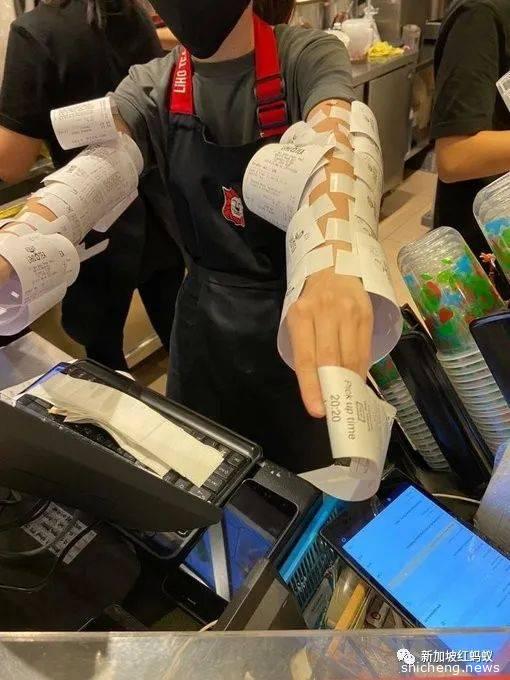 忙得不可开交的泡泡茶店员只能将订单贴在手臂上。(面簿)