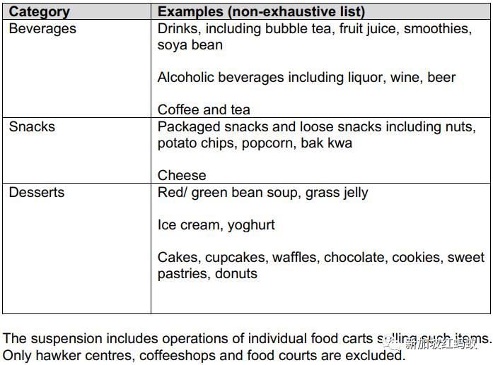 限制令也包括那些在商场或户外的手推车摊位。唯有那些在小贩中心、咖啡店和美食阁售卖饮料零食糕点的摊位,依然可以照常营业。