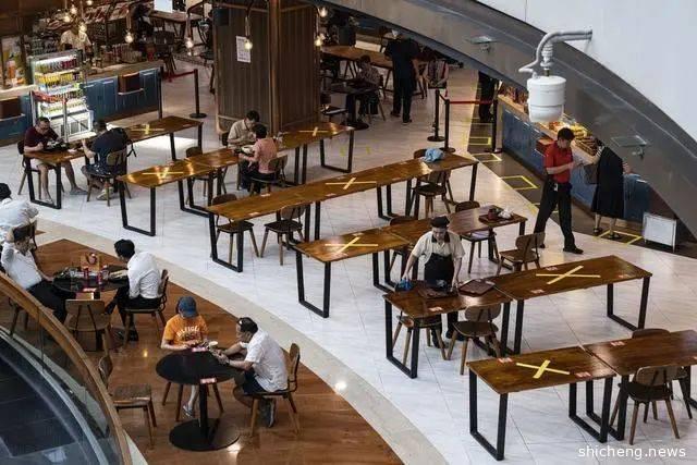 新加坡一家购物中心里的餐厅让人们保持社交距离的标记。