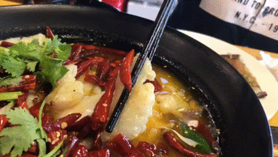 新鲜的鱼片滑入煮沸的汤汁中,十几秒就熟透了。藤椒鱼端上来要趁热吃,此时的鱼片又烫又嫩,又麻又辣,吃到停不下嘴。