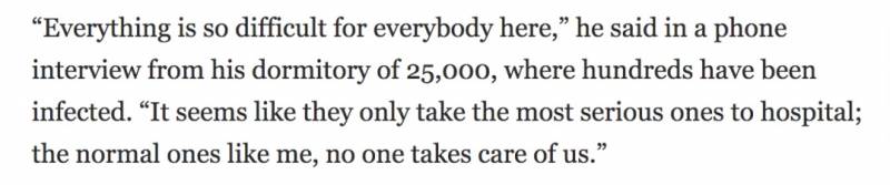 他们是这样说的:“二月的时候新加坡没有采取类似停学的强硬措施,但他们的疫情控制得很好,当时全球为新加坡冷静控制疫情而点赞,但几乎同时,一个39岁的孟加拉客工,新加坡的一百万客工中的一个,已经开始出现症状。”