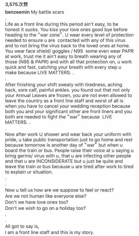 来自陈笃生医院的Benzeemin2月时因为在回家的MRT上身穿医院的制服,得到了同车厢的人们的指责: “他身上肯定有细菌和病毒!” “真是影响大家!” “不考虑一下就坐公共运输!” 他当下选择了沉默,默默下了车。回家后,他在instagram上写道:“请告诉我,我们这些医疗人员应该怎么做?难道我们和其他人不一样吗?”