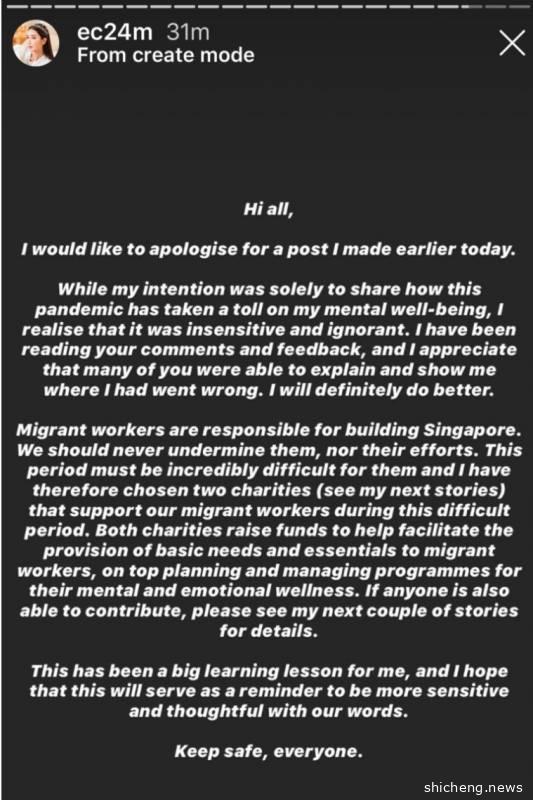 大概意思就是:我错了!太傲慢和自大了!客工们为新加坡做出了贡献。谢谢你们指出我的错误!