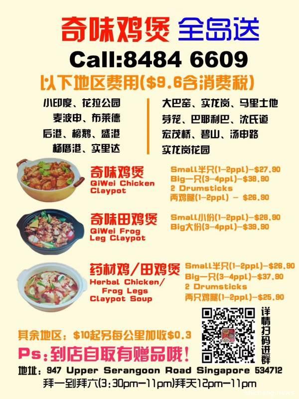 外卖福利: 现《奇味鸡煲》“全岛送”进行中 起步价$9.8,超过每公里加$0.3 到店自取更有赠品相送
