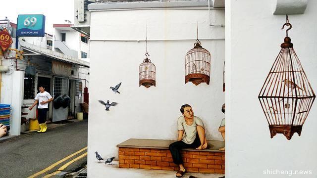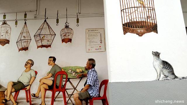 成保巷口一幅壁画描绘过去人们遛鸟的情景。随着酒店的兴建,遛鸟角落已停止使用。游客只能在此遥想当年百鸟争鸣的情景。所幸酒店业者感念这里的浓郁人文气息,也曾在这里举办多次的鸟儿歌唱比赛。