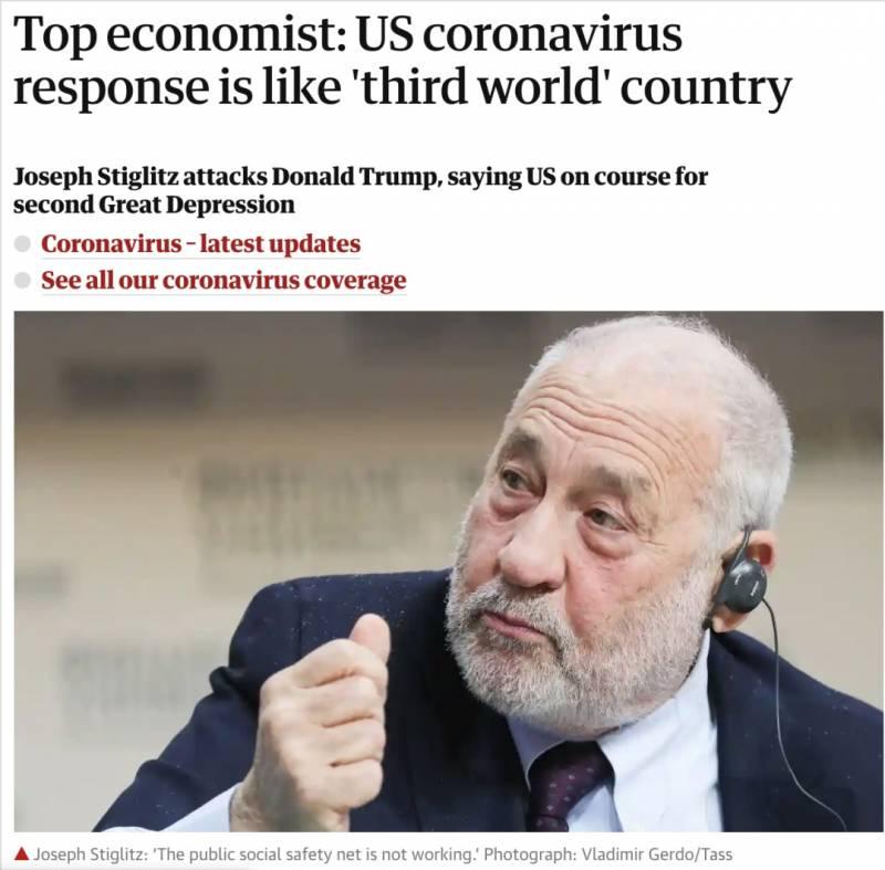 “美国总统特朗普对新冠病毒危机的糟糕处理,让美国看起来像是一个第三世界国家,并可能导致第二次大萧条。”
